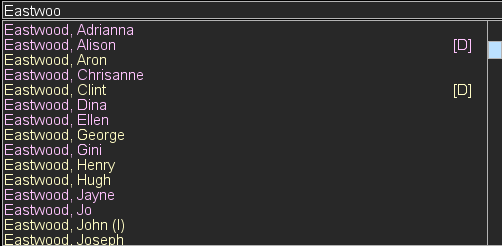 A person can be selected using a drop-box, which lists all the persons that matches with the typing of the user. This drop-box provides an interactive and user-friendly way to select a person quickly from large number of people (roughly 750,000 actors and directors). A multi-level index map (4 levels of indexing) is used for quickly updating large list for the drop-box. Actors and actresses are shown using different colors and directors are shown using an icon along with their name. So this all-in-one drop-box provides a single place to choose a person. Additionally, brushing the name of the actor in the list causes the graph to be updated interactively, allowing the user to glimpse over a large number of actors or directors in few seconds.
