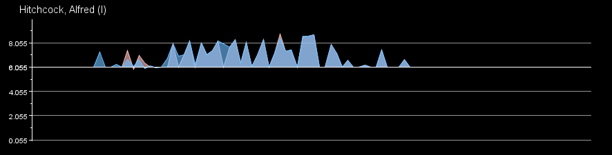 The visualization shows a number of graphs that are aligned in the X axis (time). Each of these charts the rating of a single actor, actress, or director over time. The rating is calculated by averaging the rating of movies the actor or director worked on in a single year. The visualization provides a number of interactive features: