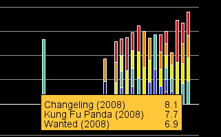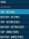 The visualization also contains a listing of the top/bottom actors, actresses, and directors for every decade, starting with 1910 and ending with 2000. The criteria used to determine this listing is discussed later. To bring up any of these listing, the user right-clicks anywhere in the timeline within the desired decade, causing a list to popup allowing the user to select a listing of top/bottom actors or directors of that corresponding decade.
