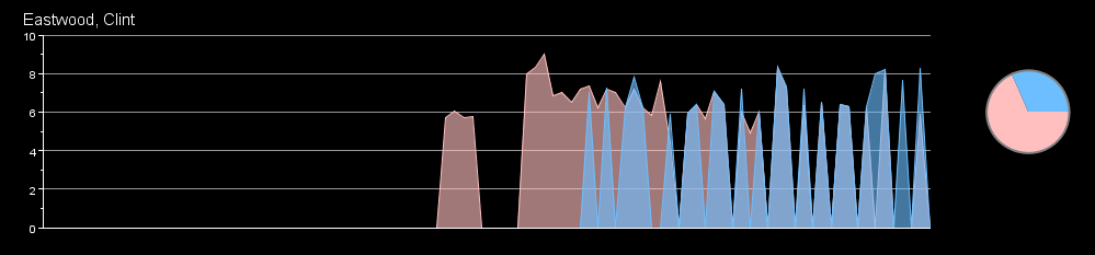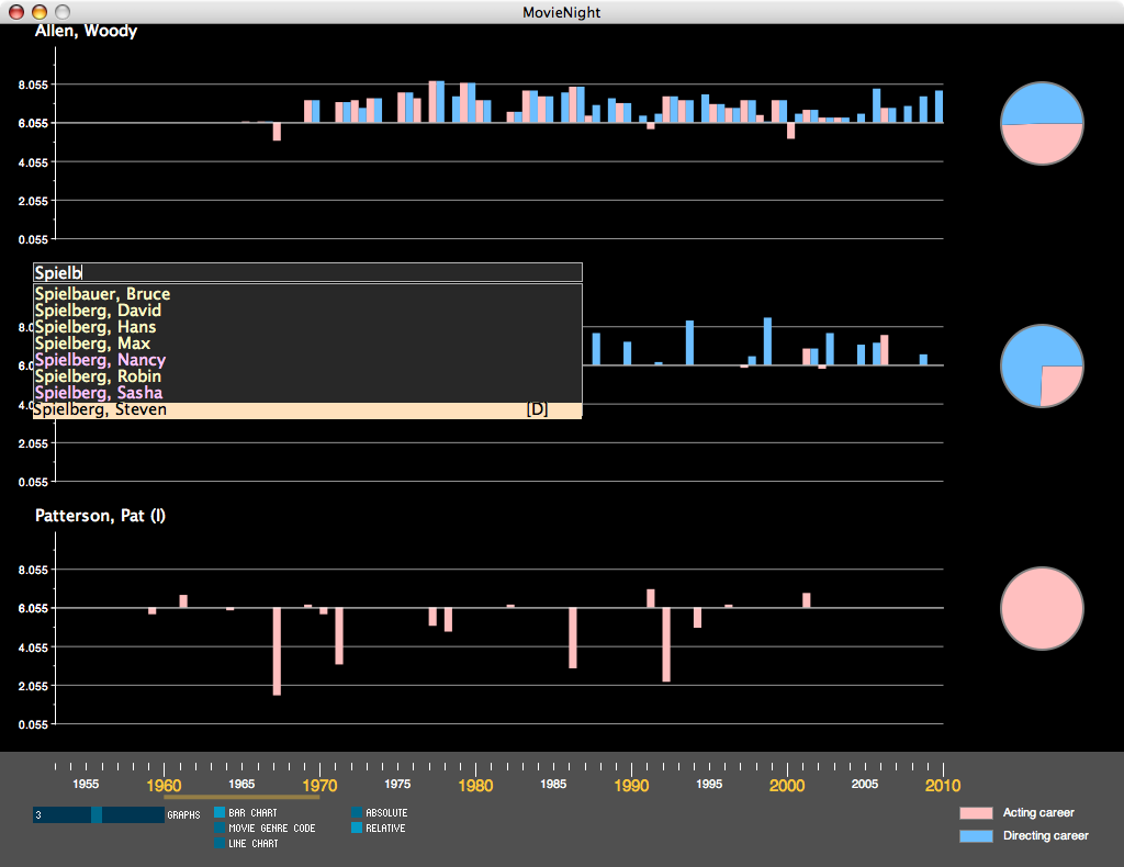 Hovering with the mouse over a timestep shows a list of movies the cast member worked on, along with the individual rating of these movies. The graph can either display the absolute rating, or a relative rating calculated from the average rating of all movies at all times. The number of graphs can be increased/decreased using a slider (located in the bottom panel of the visualization). Additionally, the time period shown in the graph can be expanded or contracted to visualize any time-frame with in 1910 to 2010. The mouse wheel is used to expand/contract the time-frame. Dragging with the left mouse button can be used to pan the graph in time.